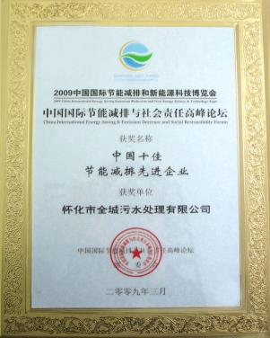 2009年3月在胡錦濤、溫家寶等中央領導出席的中國國際節(jié)能減排與新能源科技博覽會和高峰論壇上評為“中國十佳節(jié)能減排先進企業(yè)”。